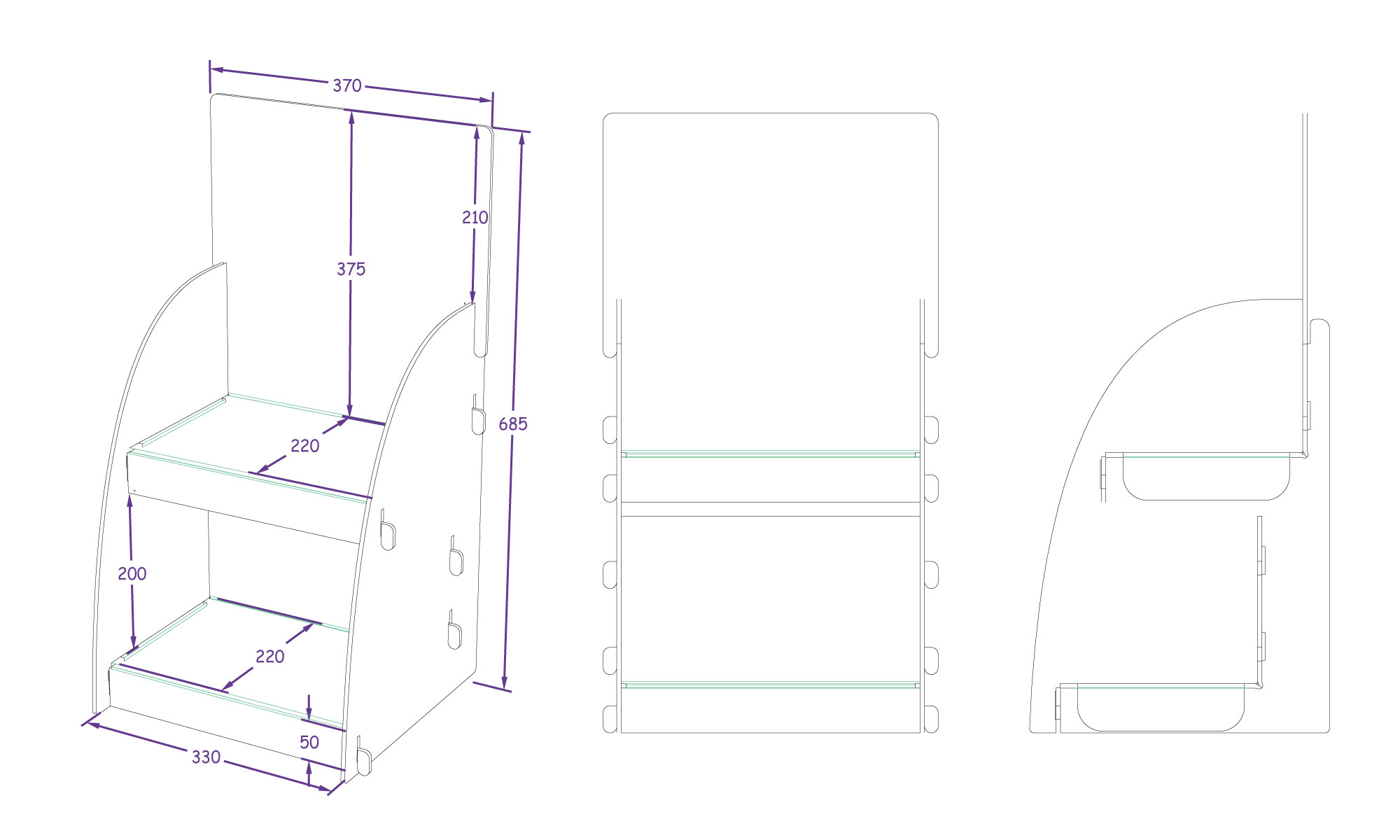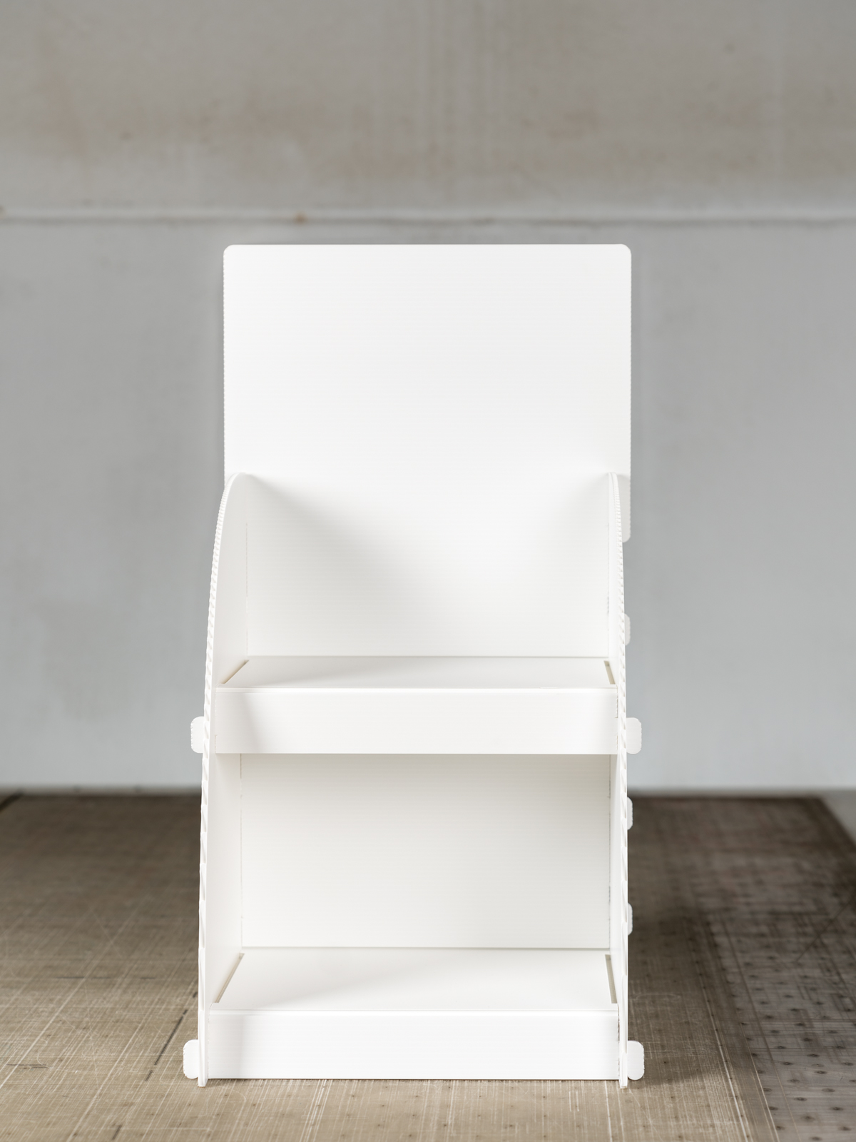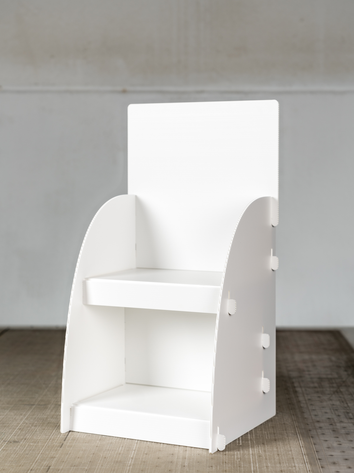 Realizzabile nei nostri 6 colori standard (bianco, nero, giallo, verde, rosso, blu) l’espositore a ripiani può essere personalizzato in stampa serigrafica o in digitale, da valutare in base al quantitativo richiesto e al tipo di grafica da riprodurre.