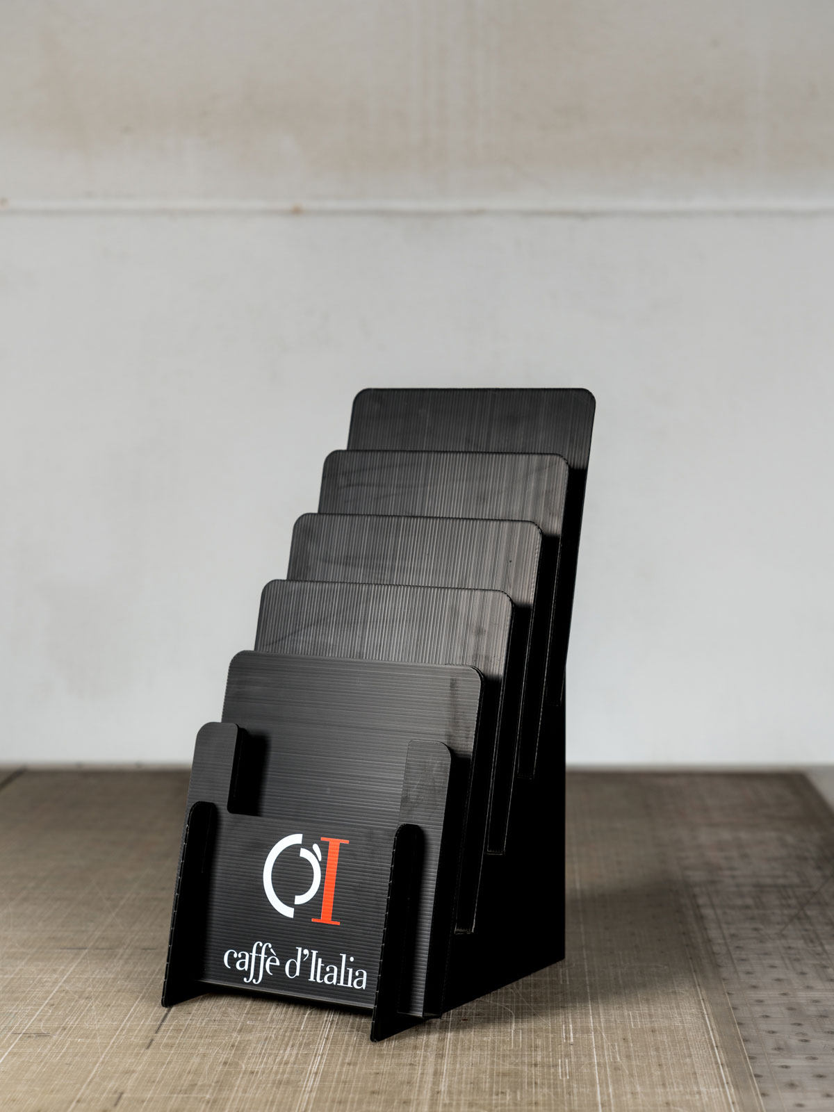 UTILIZZO E CURA: L’espositore da banco per riviste è realizzato in polipropilene alveolare, un materiale resistente agli urti, lavabile, sterilizzabile, atossico, inodore, impermeabile.