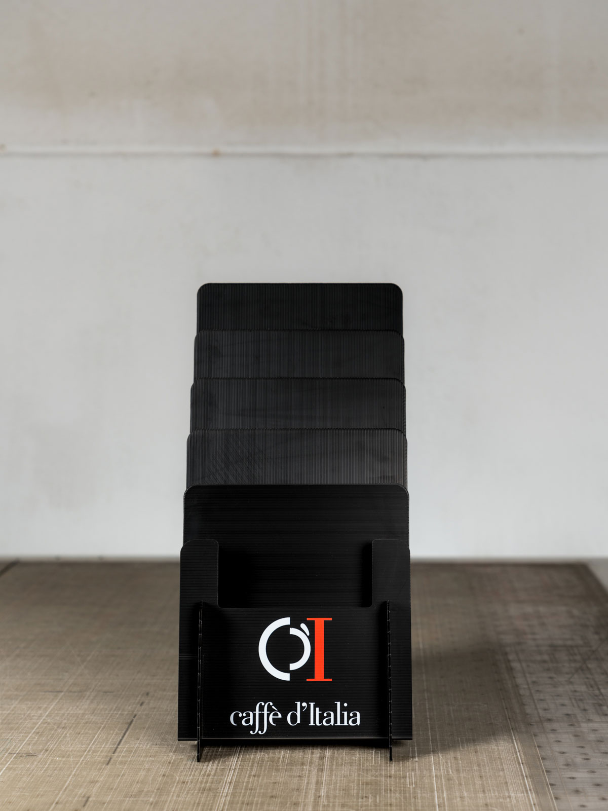 Grazie alle caratteristiche del polipropilene alveolare in cui è realizzato, l’espositore può essere anche collocato all’aperto in quanto non teme acqua ed umidità.