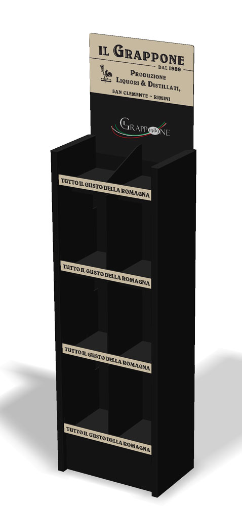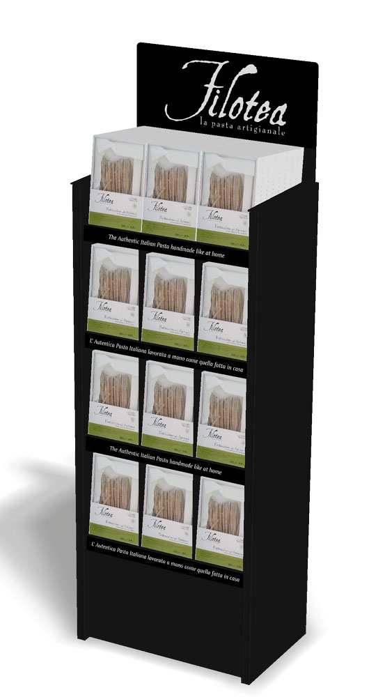 MUST: l’espositore elegante realizzato in materiale nero mette molto in risalto i prodotti al suo interno.